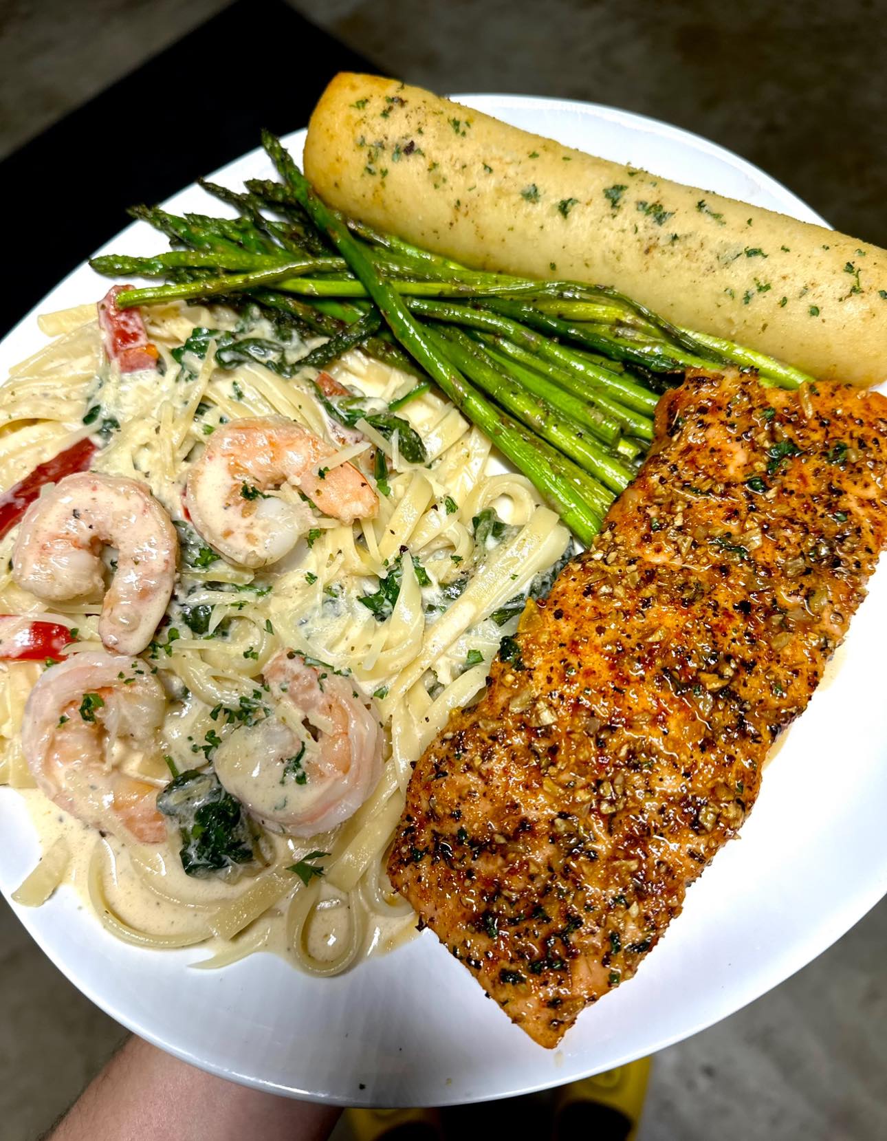 ๐ค๐ Creamy Shrimp Pasta Plate ๐ Ingredients: For the Pasta: For Garlic Butter Breadsticks: ๐จโ๐ณ Instructions: 1. Cook Pasta 2. Cook Salmon 3. Cook Shrimp 4. Sautรฉ Asparagus 5. Make Cream Sauce 6. Combine 7. Garlic Butter Breadsticks 8. Plate It ๐ก Tips: