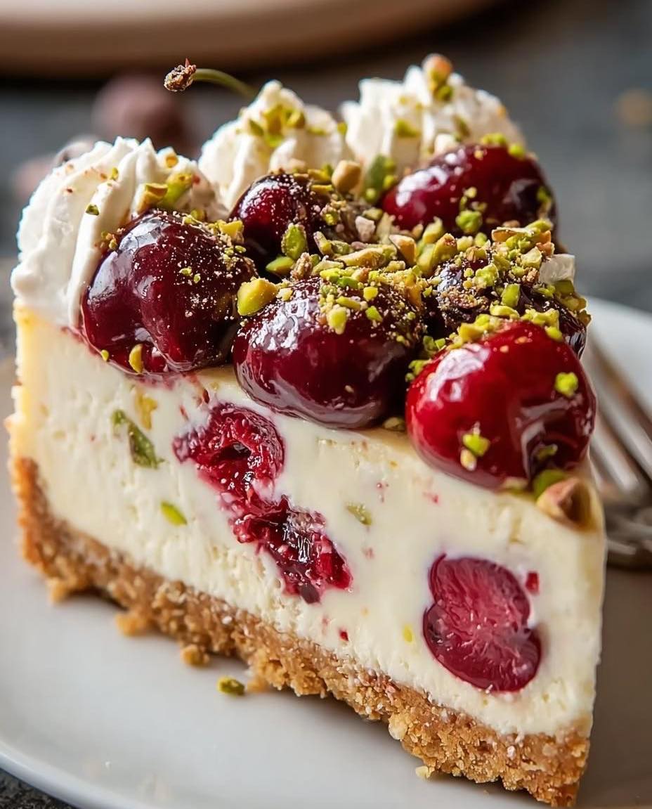 🍒 Result: A creamy, rich cheesecake with sweet cherries and crunchy pistachios that creates a beautiful balance of flavors and textures in every bite.