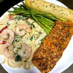 🍤🐟 Creamy Shrimp Pasta Plate 📝 Ingredients: For the Pasta: For Garlic Butter Breadsticks: 👨‍🍳 Instructions: 1. Cook Pasta 2. Cook Salmon 3. Cook Shrimp 4. Sauté Asparagus 5. Make Cream Sauce 6. Combine 7. Garlic Butter Breadsticks 8. Plate It 💡 Tips: